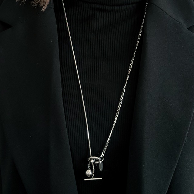 静かに、軸になる。 ご好評いただいていたアンカーマンテルのロングネックレスを、デザインはそのままに、チェーンの仕様を見直してリニューアル。 あわせて、装いの軸になる存在感を込めて、「Anker」と名付けました。 アンカーマンテルに加え、スライダー付きのため、長さ調整をしてもずれにくいのが特徴。 ロングやY字、ショートネックレスとして着用した際も、バランスを保ったままスタイリングを楽しめます。 異なる表情のチェーンを組み合わせることで、シンプルでありながら奥行きのあるバランスに。 縦のラインが強調され、装い全体をすっと引き締めてくれます。 長さ調整ができるため、ロングネックレスとしてはもちろん、ショートネックレスとしても着用可能。 主張しすぎず、けれど確かに残る存在感。 日常に静かに寄り添う、モードでユニセックスなネックレスです。 ──────────────────── 【素材】ステンレス 【カラー】シルバー 【サイズ】約80cm(調整可) 【仕様】アンカーマンテル留め具/スライダー付き(ずれ防止) (ロング/Y字/ショート着用可) ──────────────────── ◆ おすすめスタイル モノトーンコーデやミニマルな装い、モード系ファッションに。 ジェンダーレスなスタイルや、シンプルだけど雰囲気を出したい方にもおすすめです。 ──────────────────── ◆ ラッピングについて 【無料・有料】どちらもご用意しています。 有料ラッピングをご選択いただいた場合は、ギフトボックスにお入れし、手提げ袋をセットにしてお届けします。 そのままプレゼントとしてお渡しいただける仕様ですので、大切な方への贈りものにもおすすめです。 ──────────────────── ◆ お取り扱いについて ステンレス素材は変色・サビに強く、お手入れが簡単です。 ご使用後に軽く拭いていただくと、より長くきれいにお使いいただけます。 金属アレルギーには個人差がありますので、ご心配な方はご注意ください。 ──────────────────── ◆ 発送について こちらの商品は 3日以内に発送 いたします。 発送は ゆうパケットポスト(追跡あり) にてお届けします。 全国一律 350円。 ポスト投函のため日時指定は不可となります。 ────────────────────