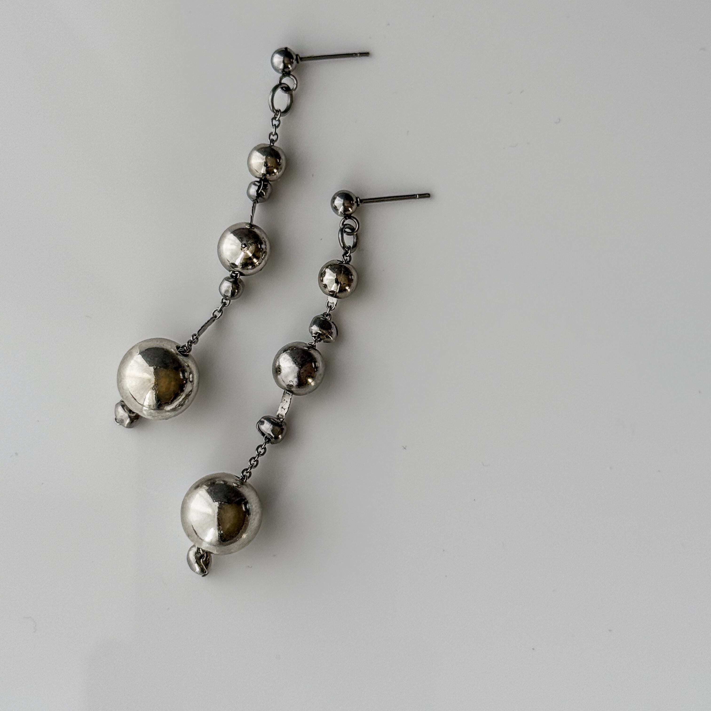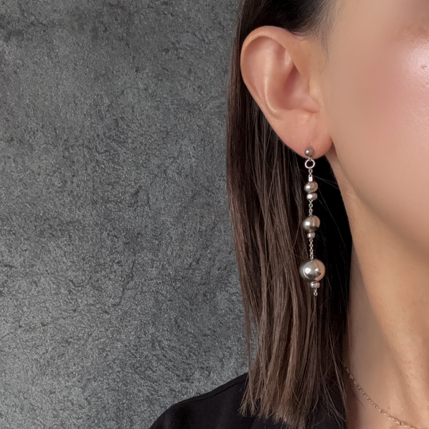 動くたびに光を受けて揺れる球体が、耳元に印象的な存在感を演出します。