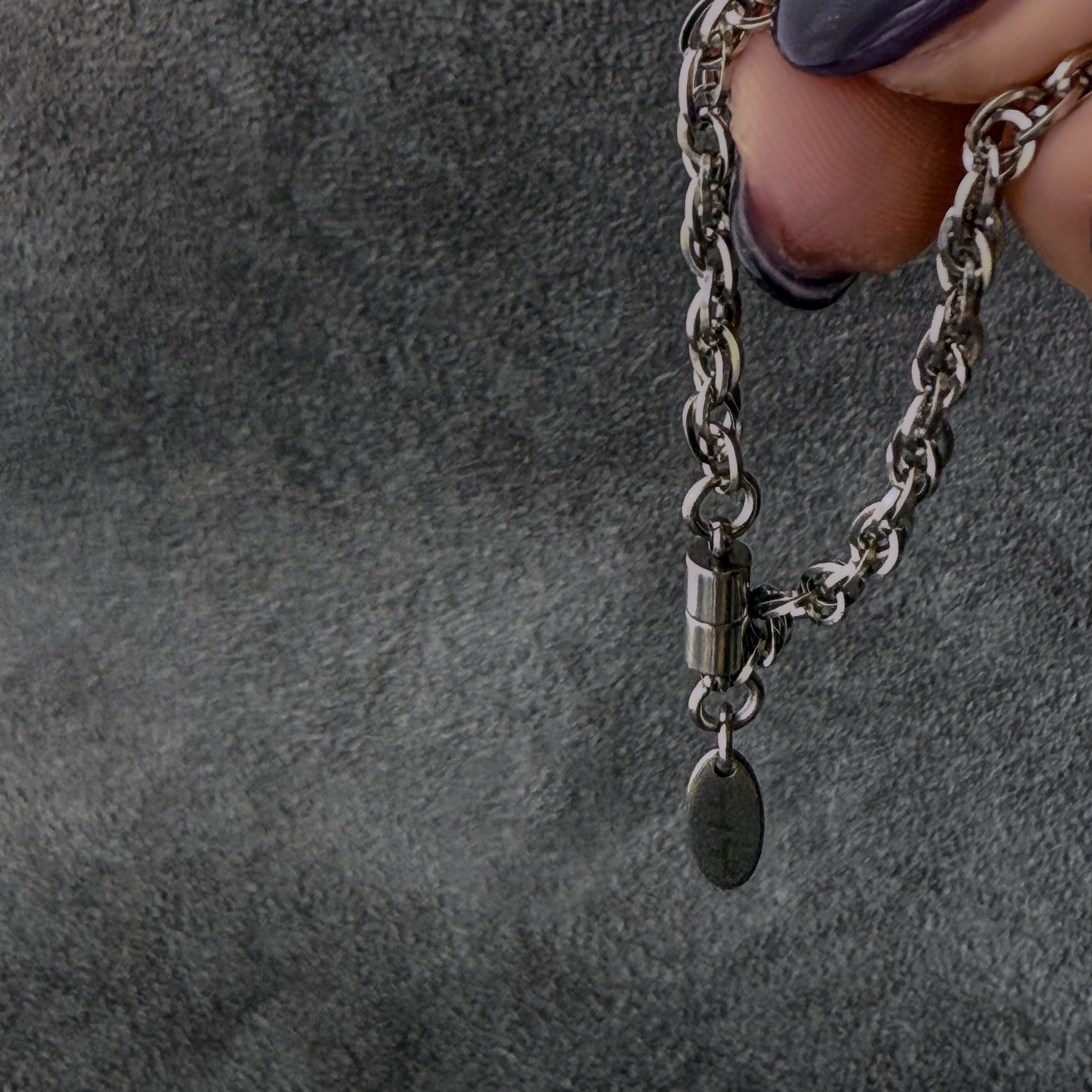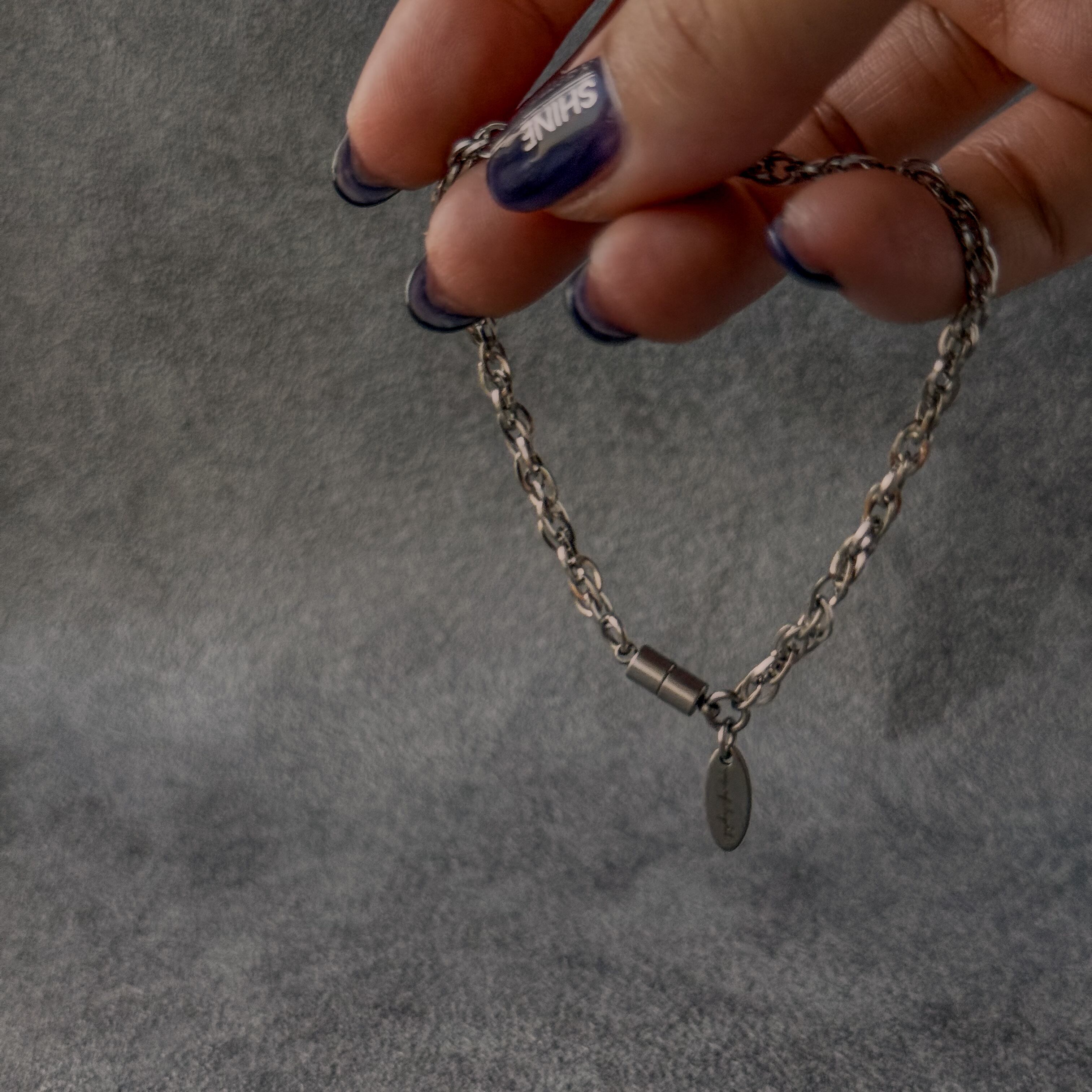 ・存在感のあるチェーンブレスレットと重ねて、コントラストのある手元に。