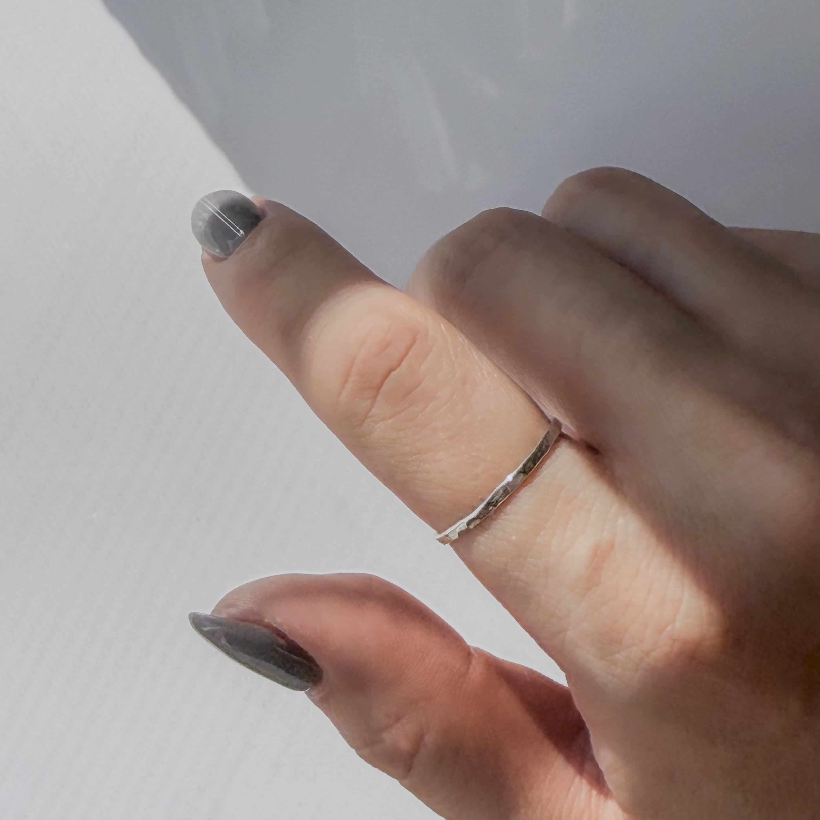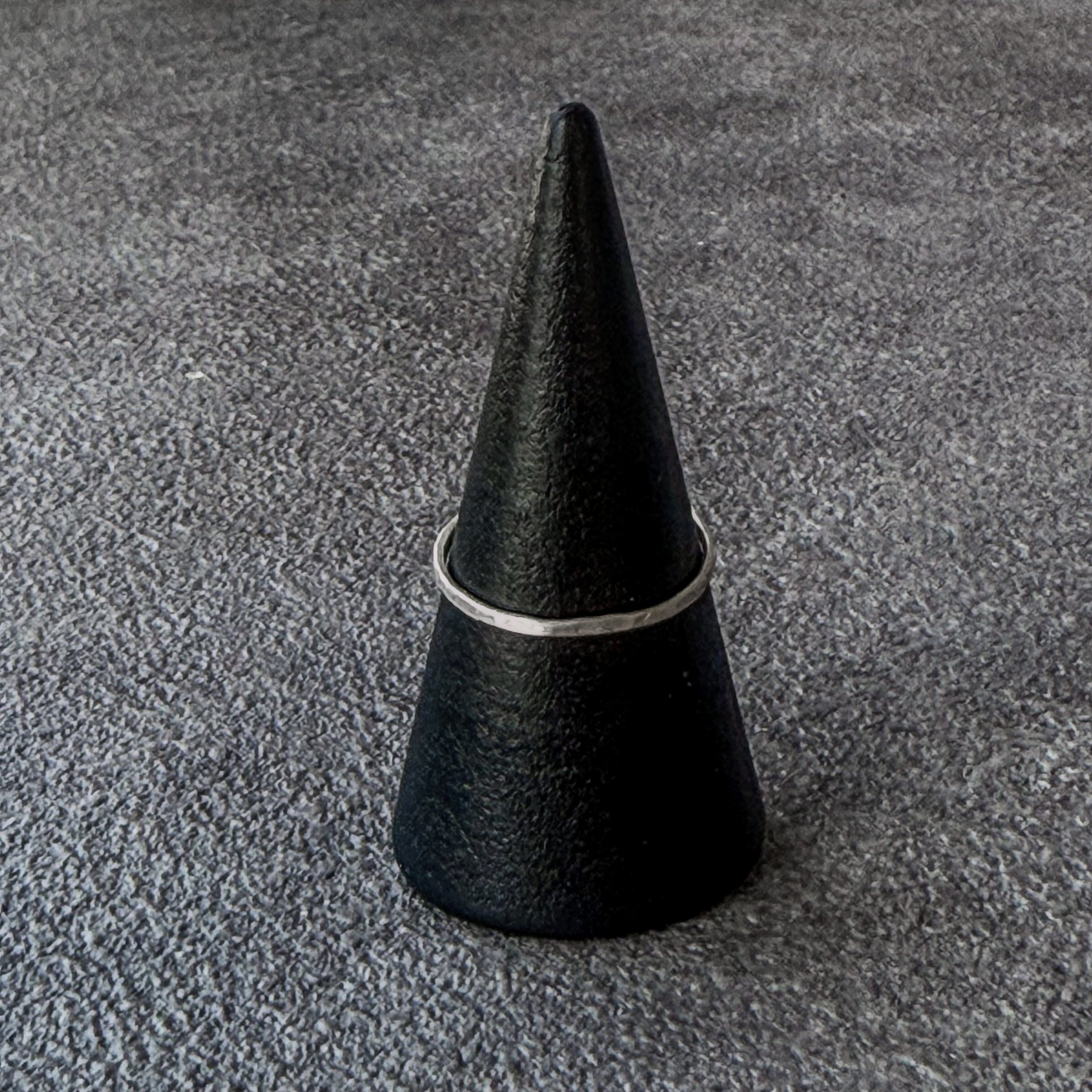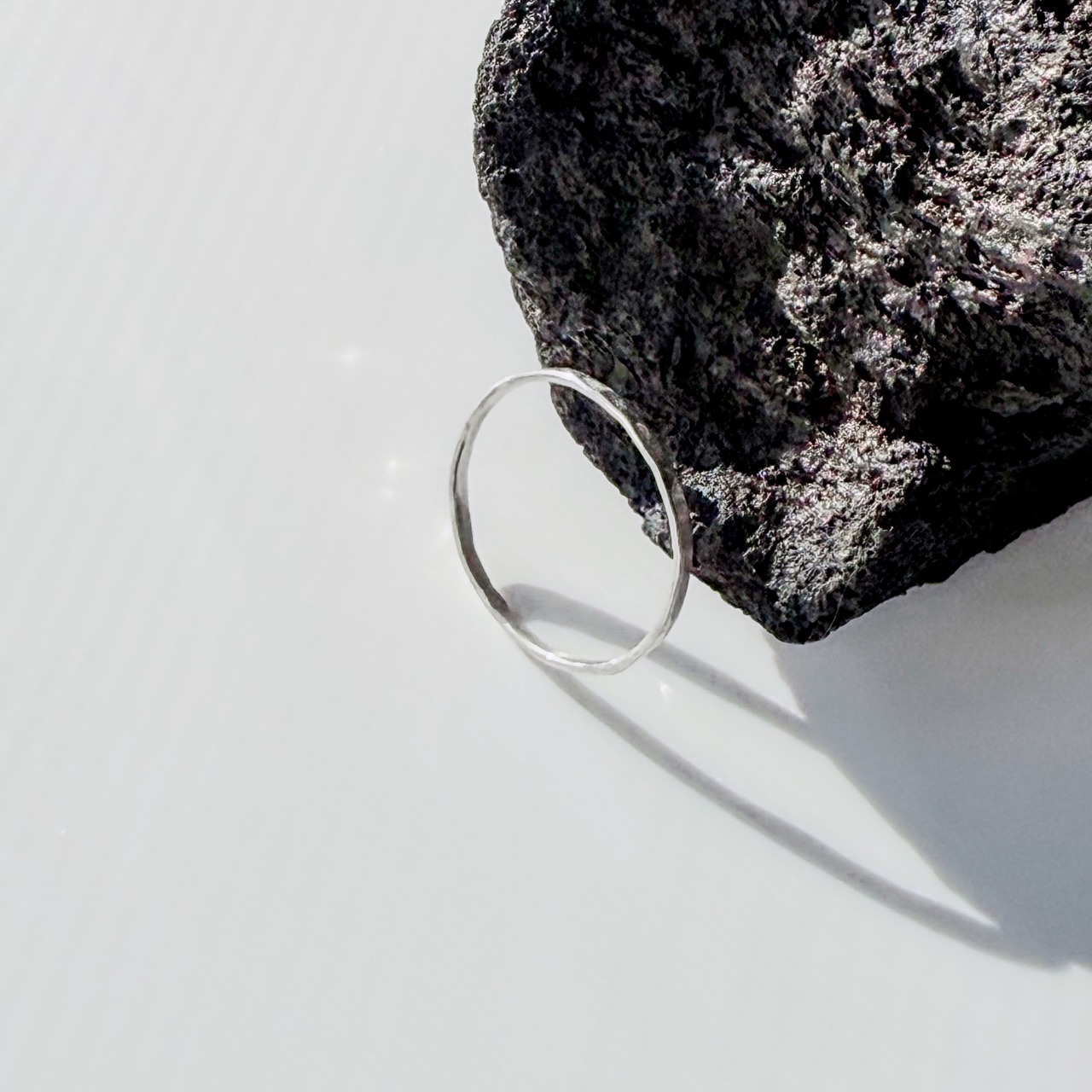ひとつひとつ槌目模様を打ち込み、さりげなく輝きを宿した細身のリング。