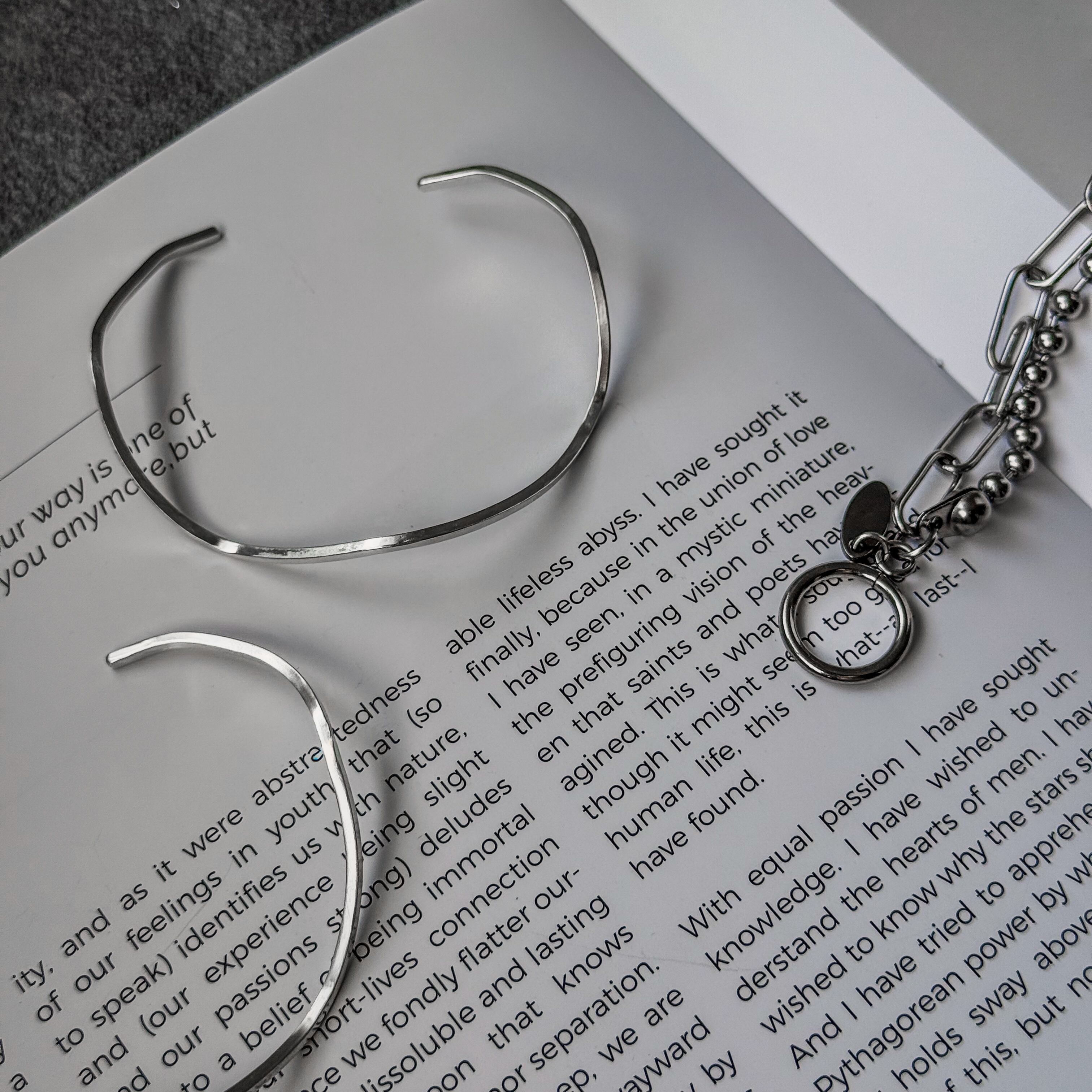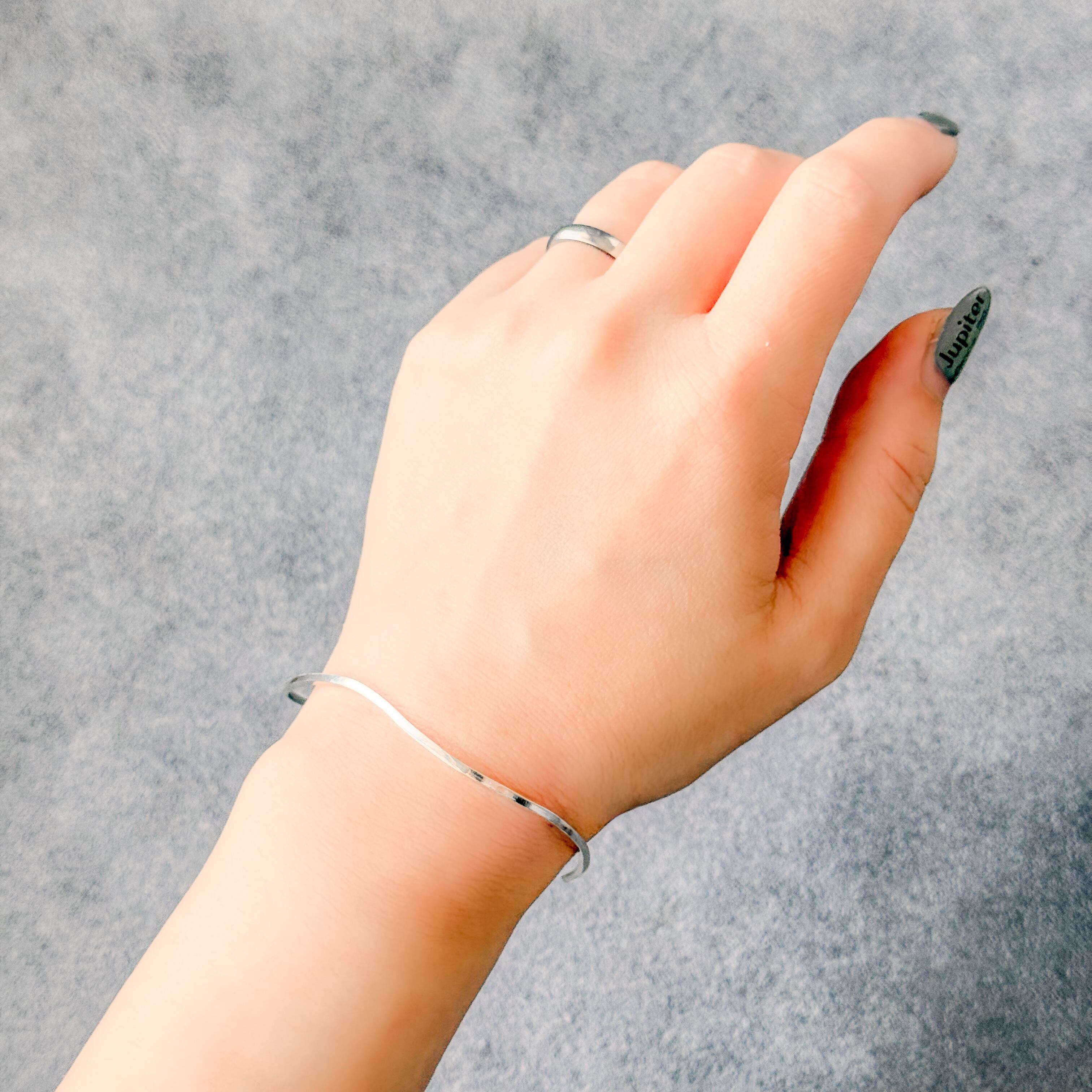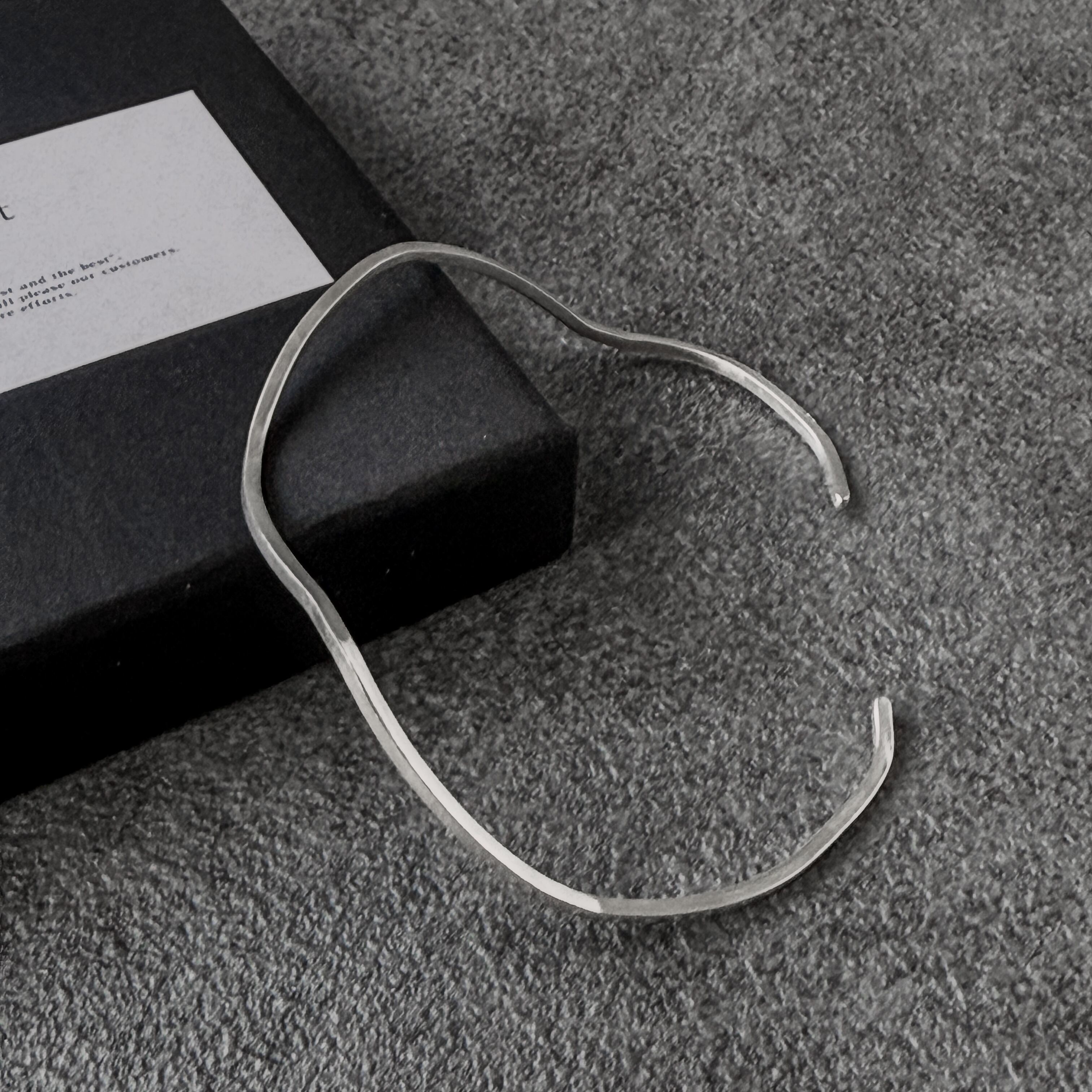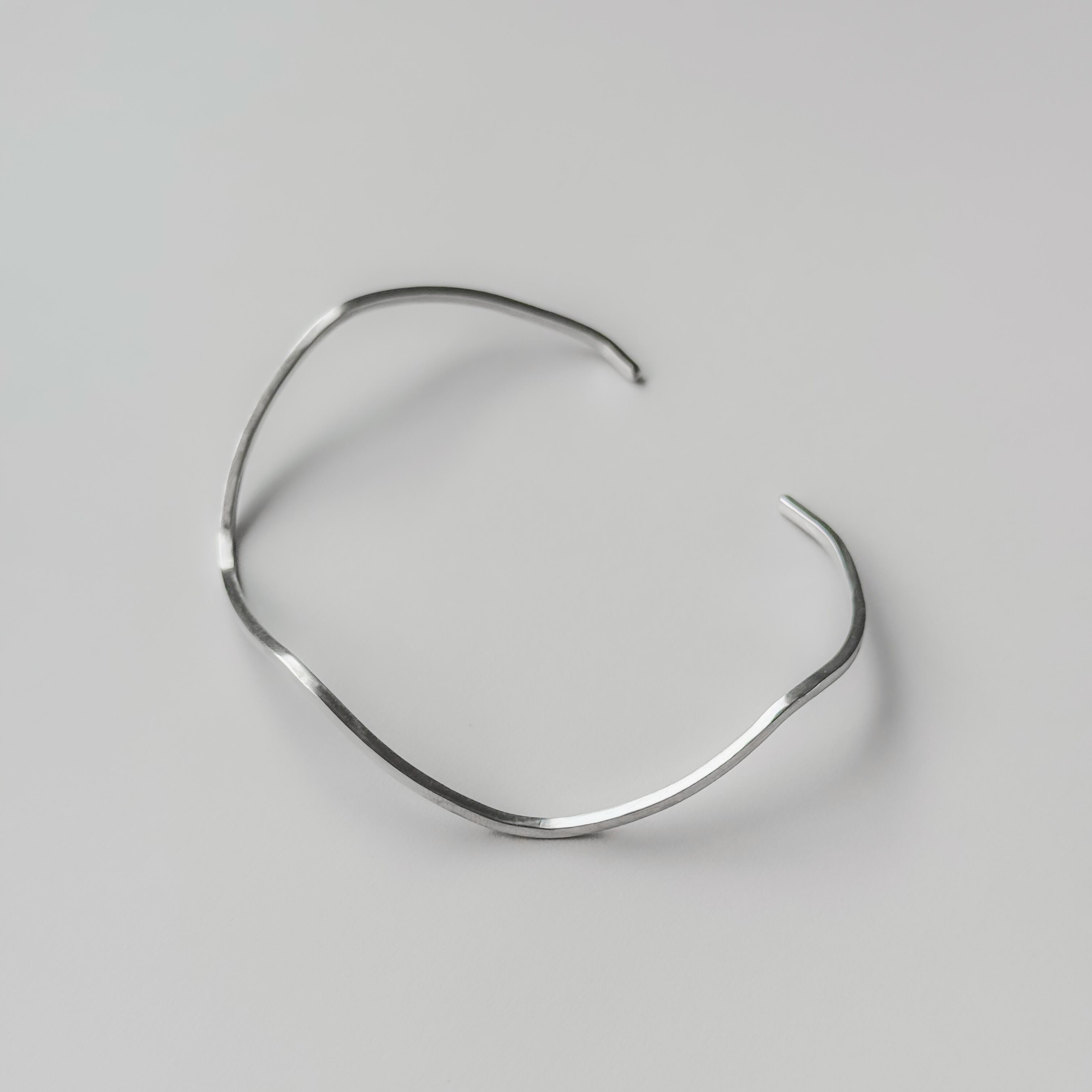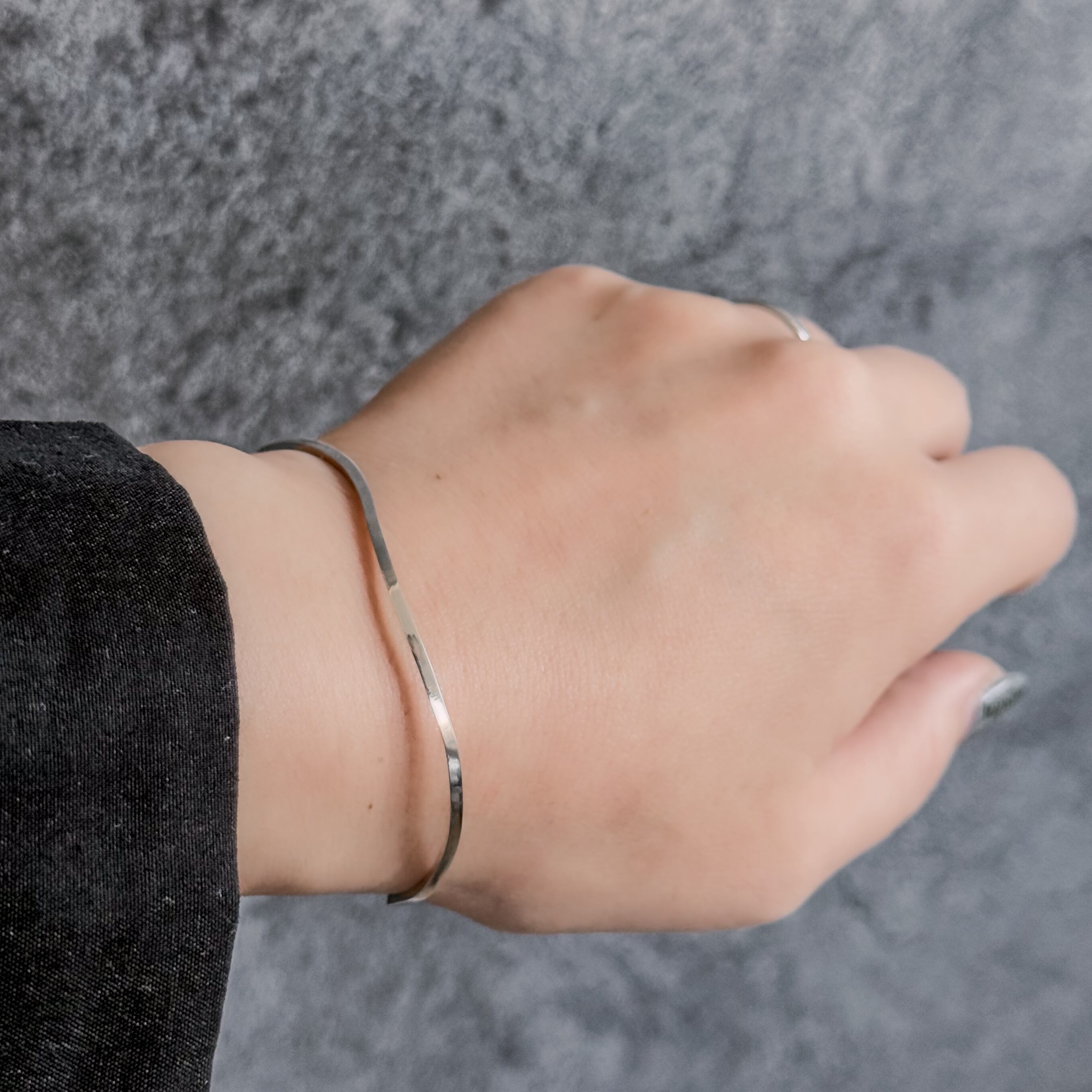 silver950の自然なツヤが、手元をやわらかく照らし、モードな装いにさりげない余韻を添えるバングルです。