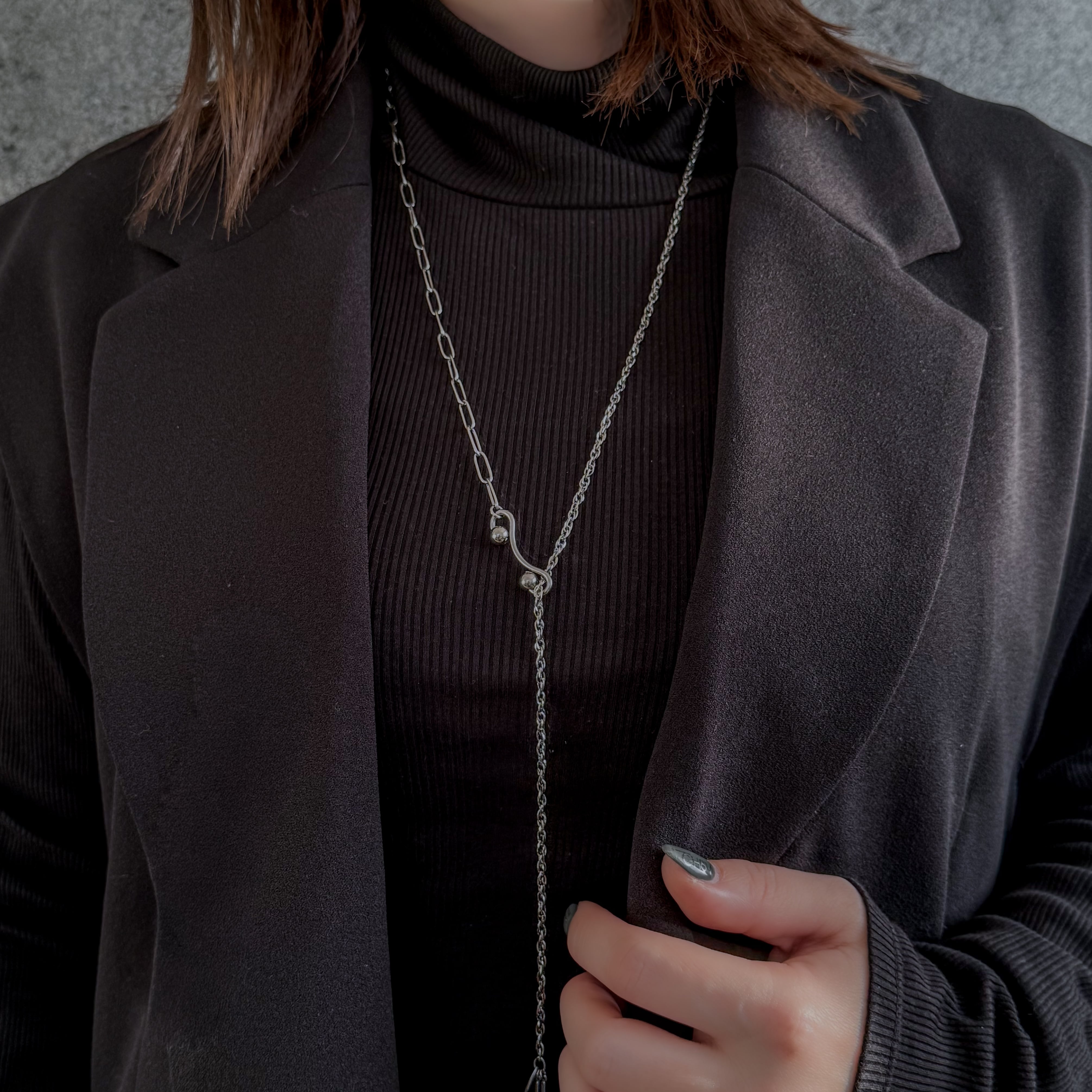 約80cmのロング仕様で、ニットやアウターにも合わせやすい一本です。