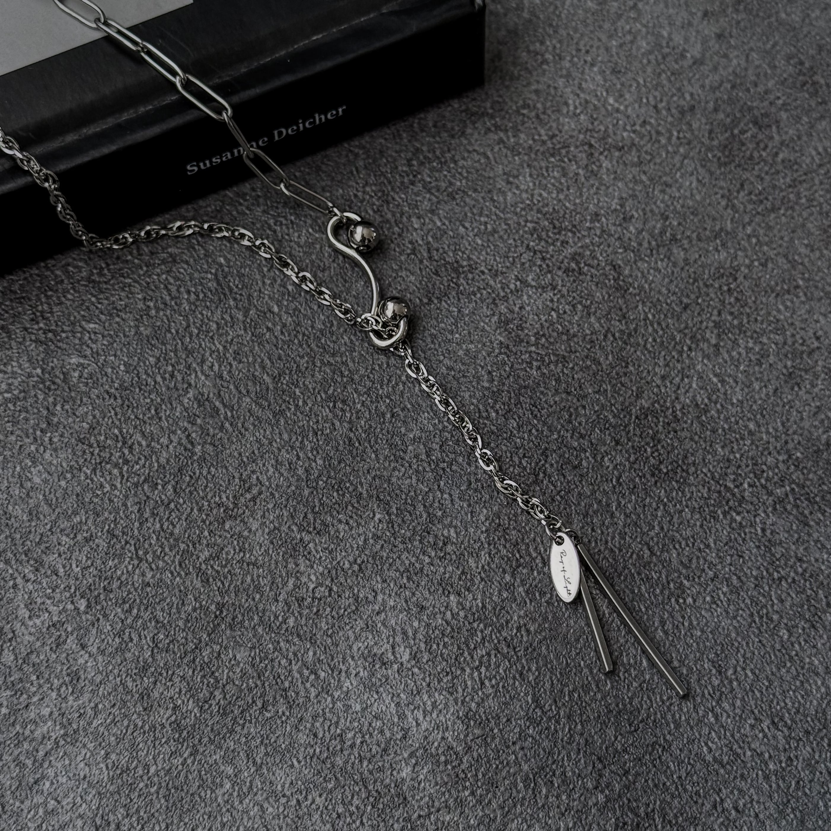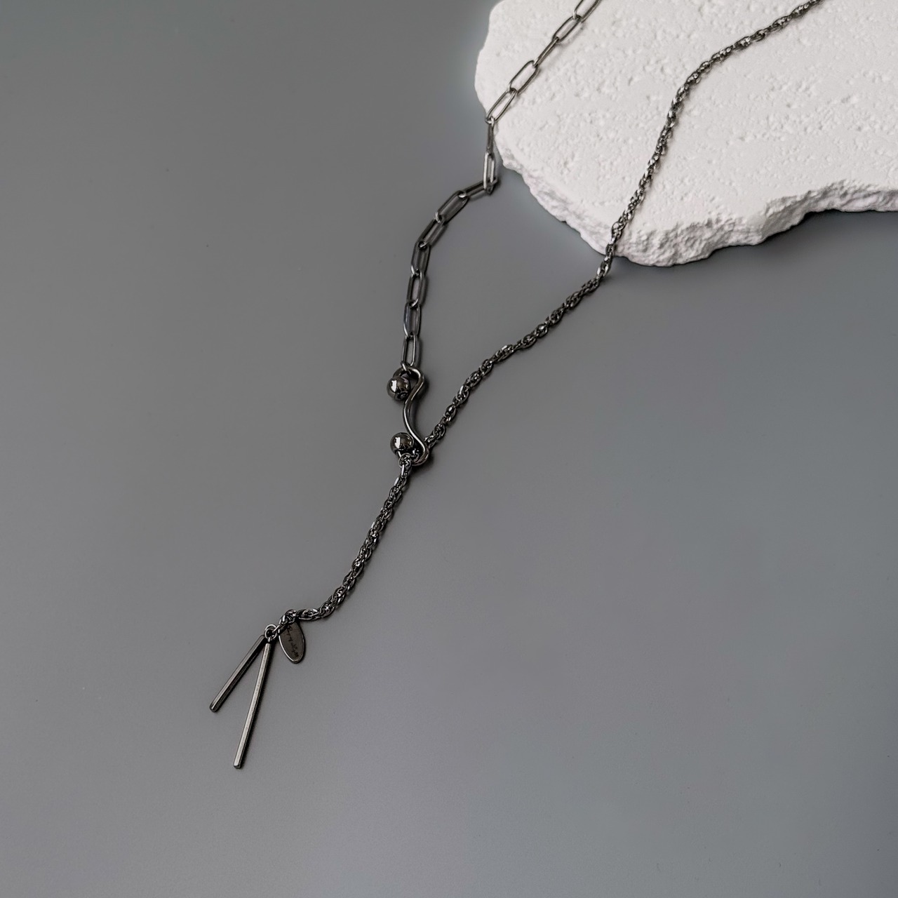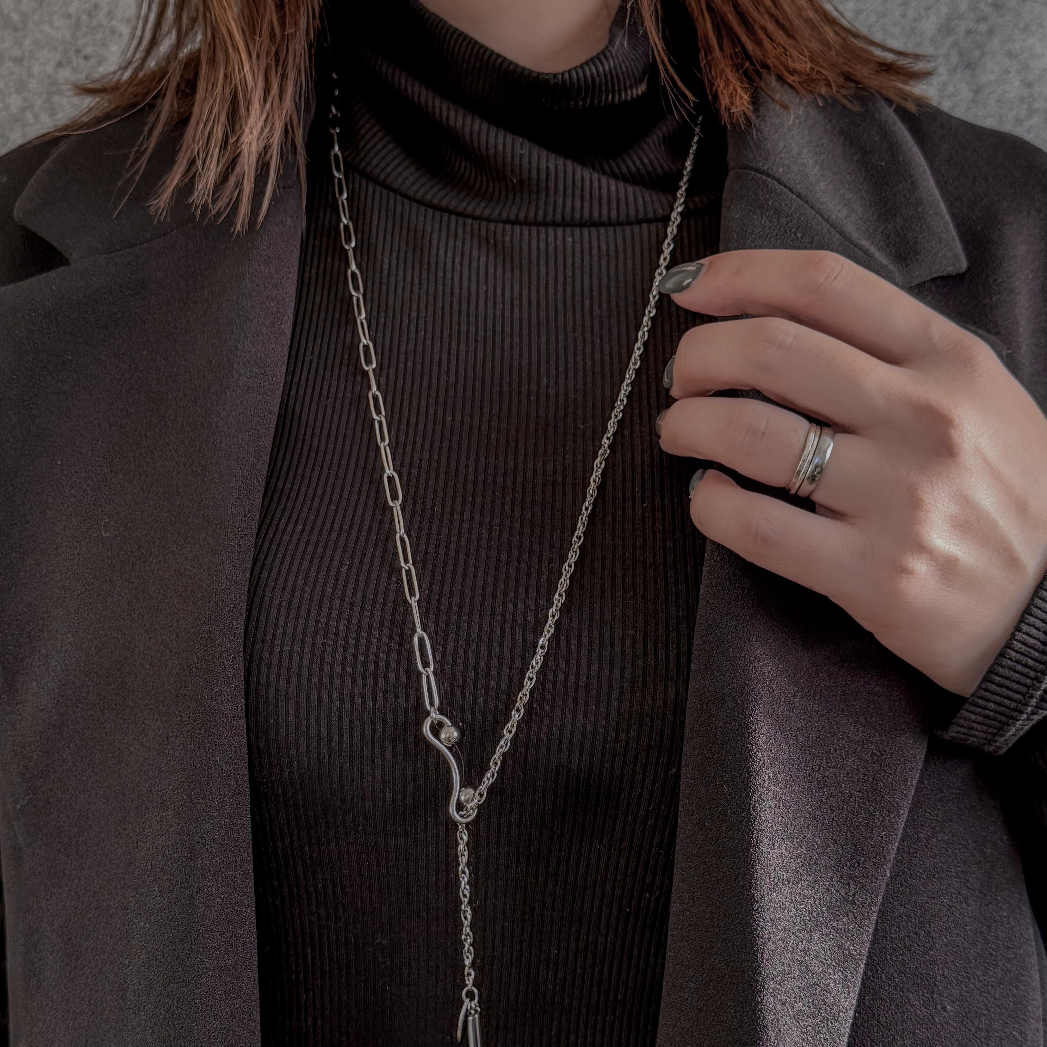 ロングにも、ラリエット風のY字シルエットにもアレンジできるアジャスト仕様。