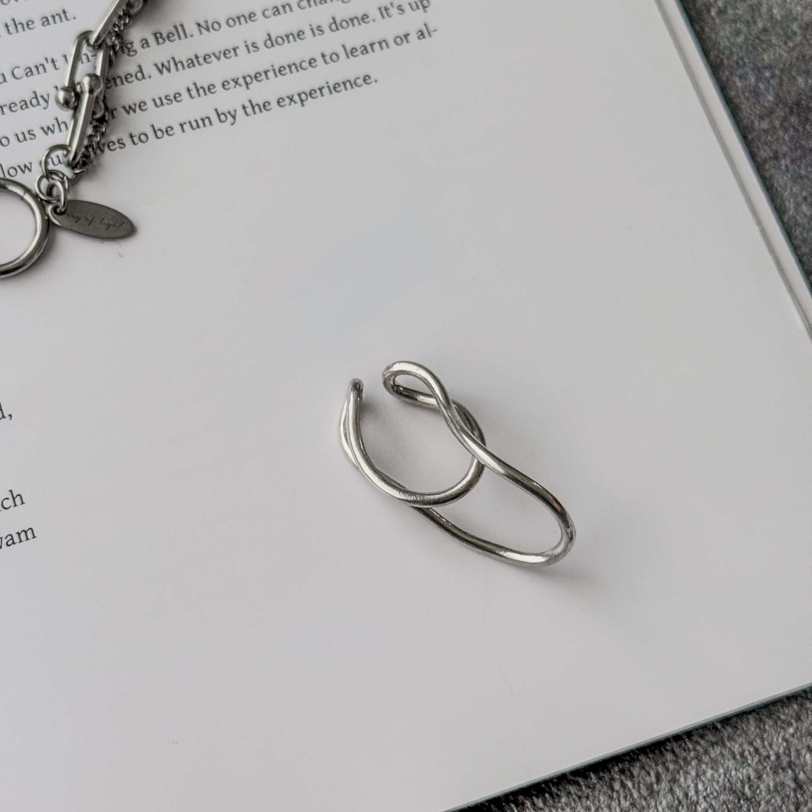 立体的なイヤカフに、指先の細身リングがバランスよく寄り添う組み合わせ。