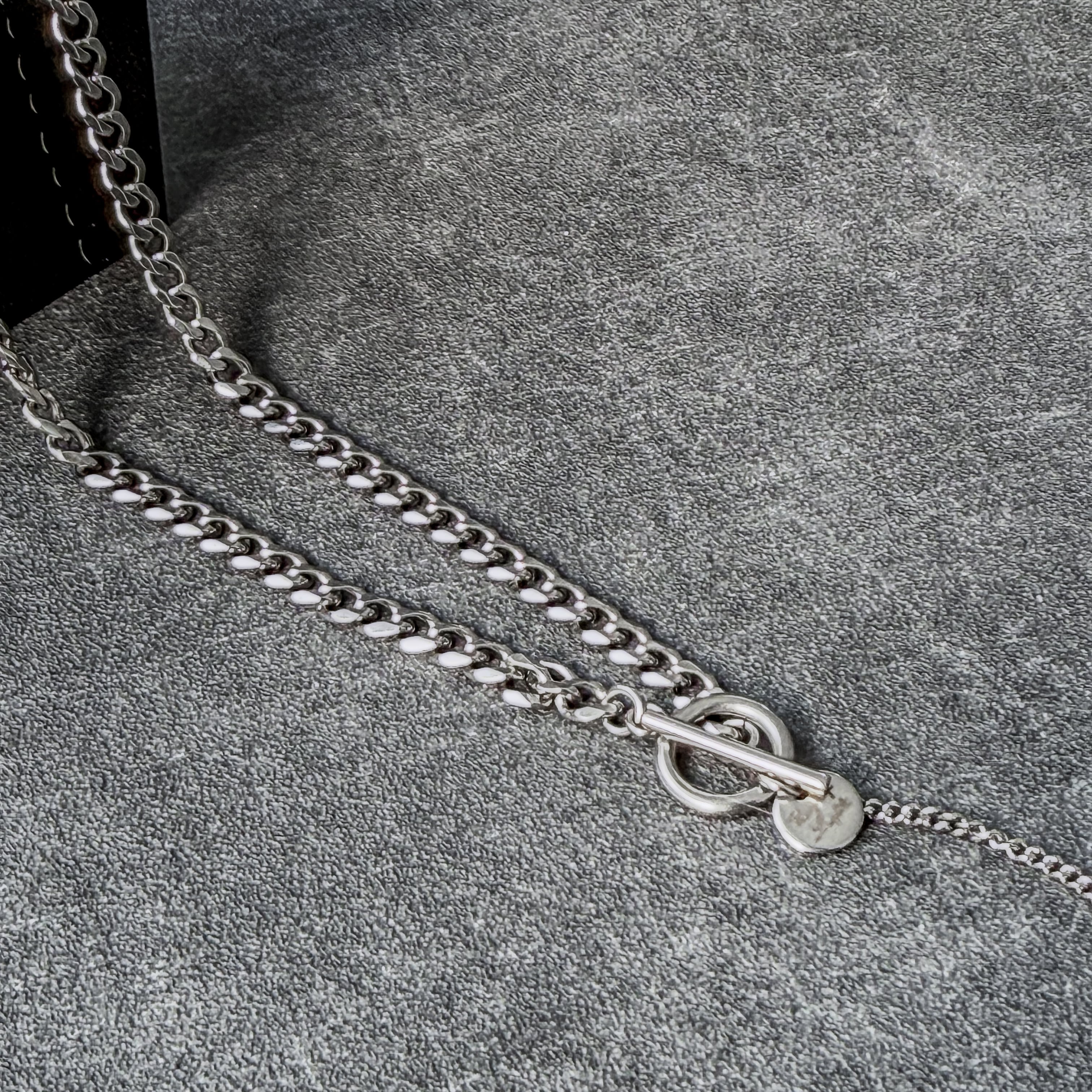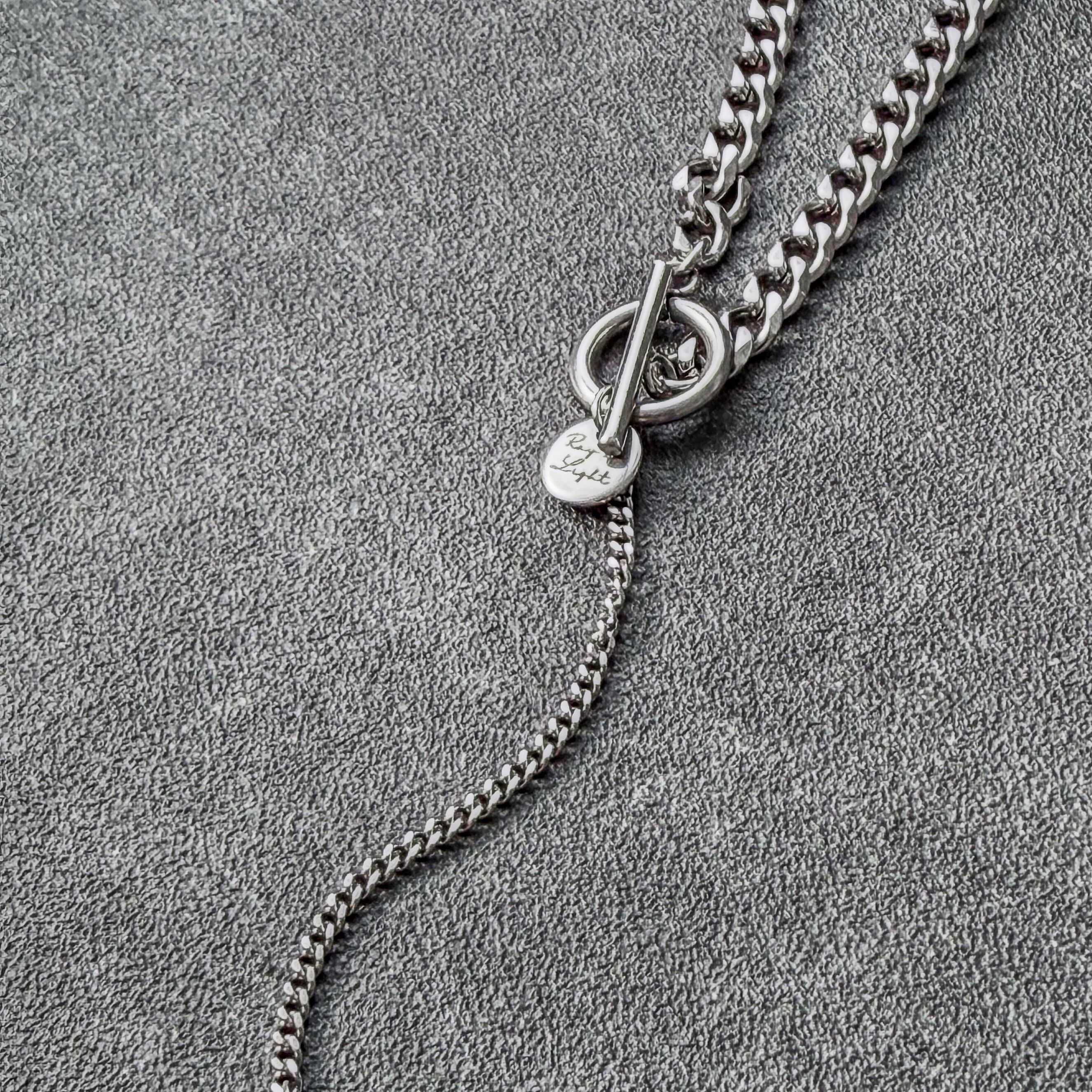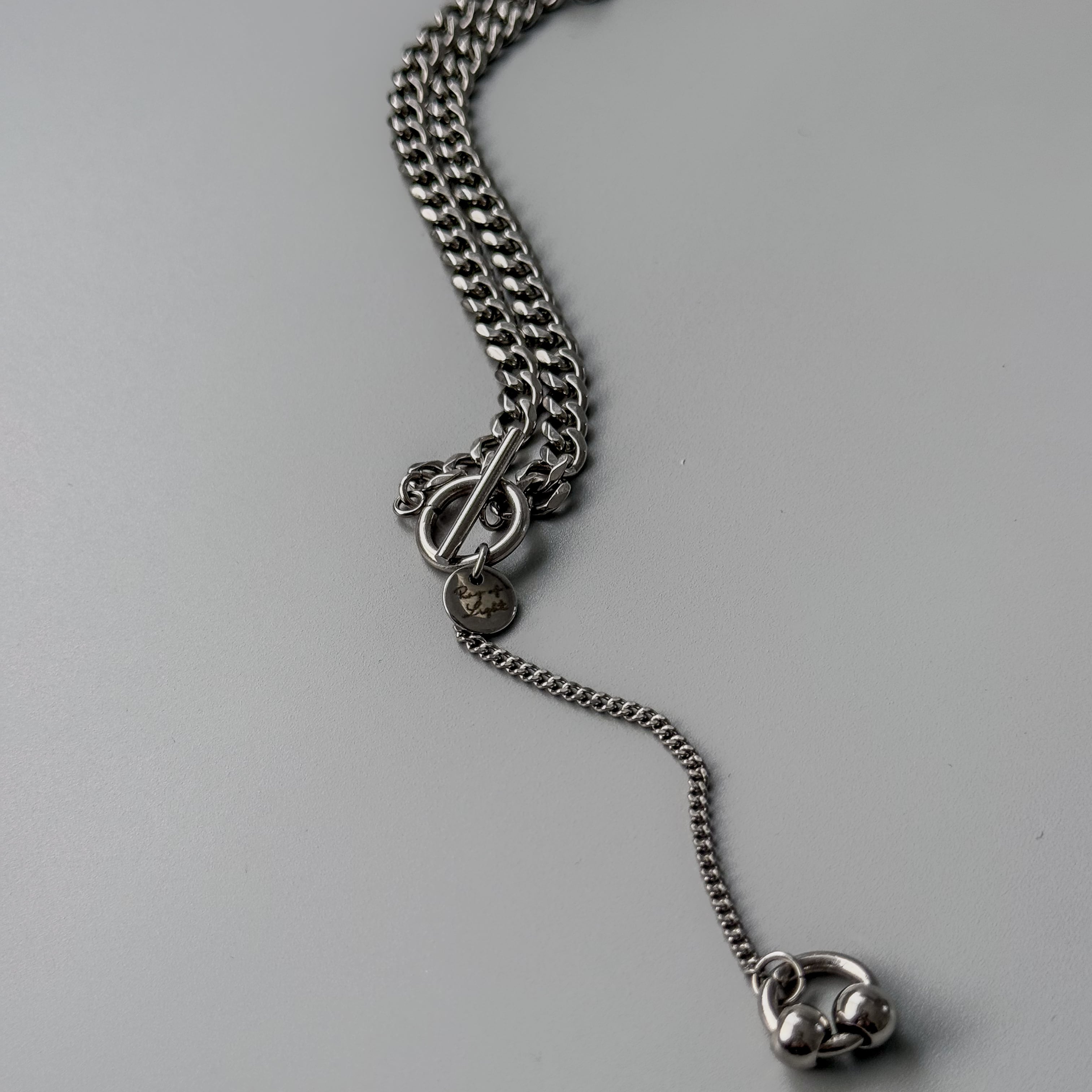 太さの異なるチェーンを組み合わせ、マンテルをデザインの軸としてフロントに配置しています。