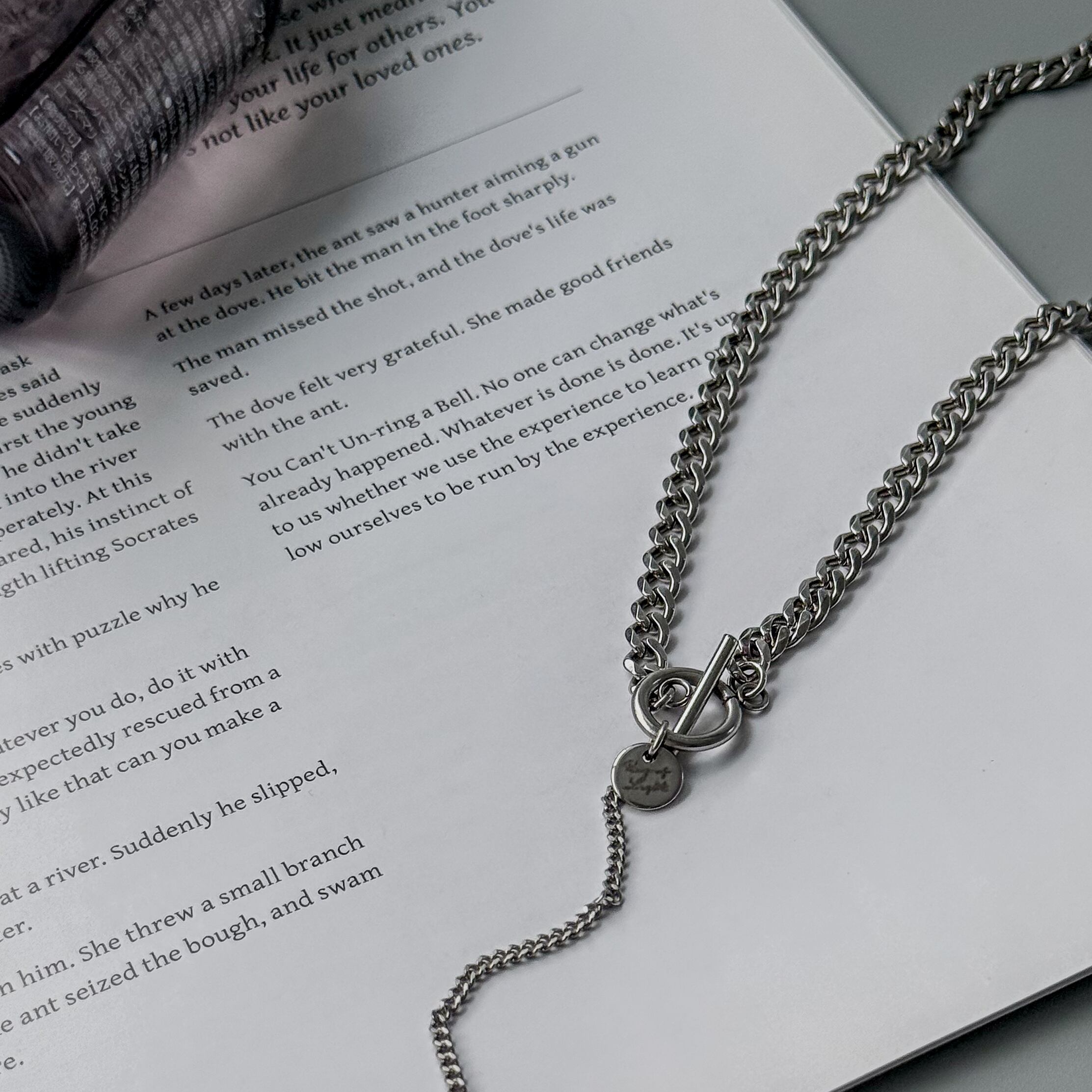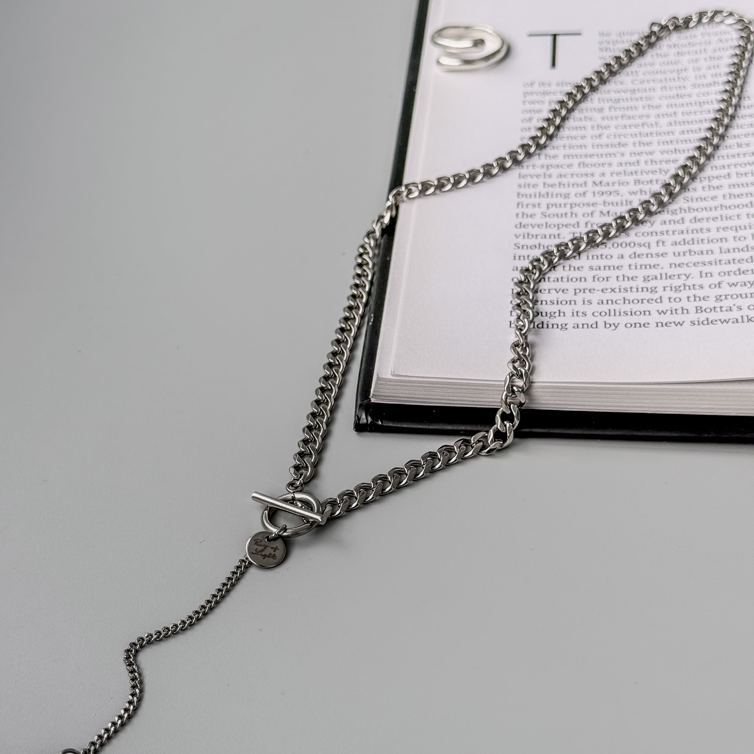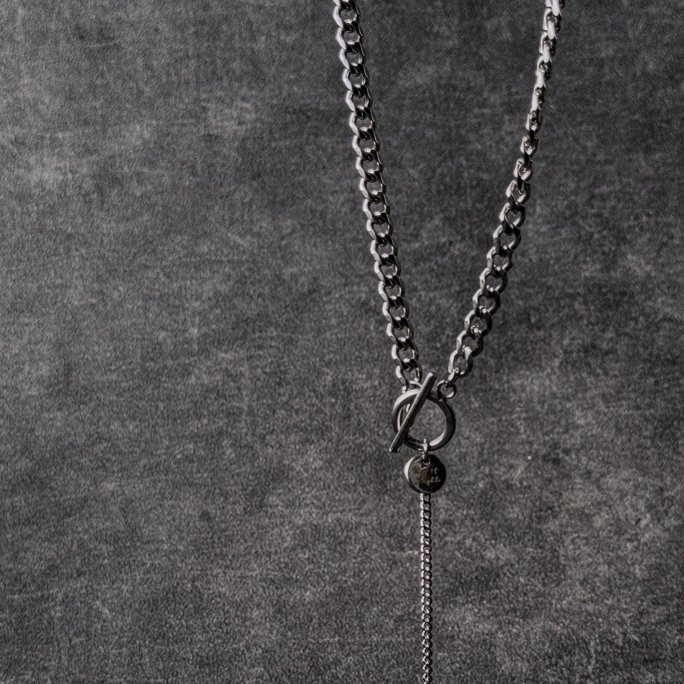 太さの異なるチェーンを組み合わせ、マンテルをデザインの軸としてフロントに配置しています。