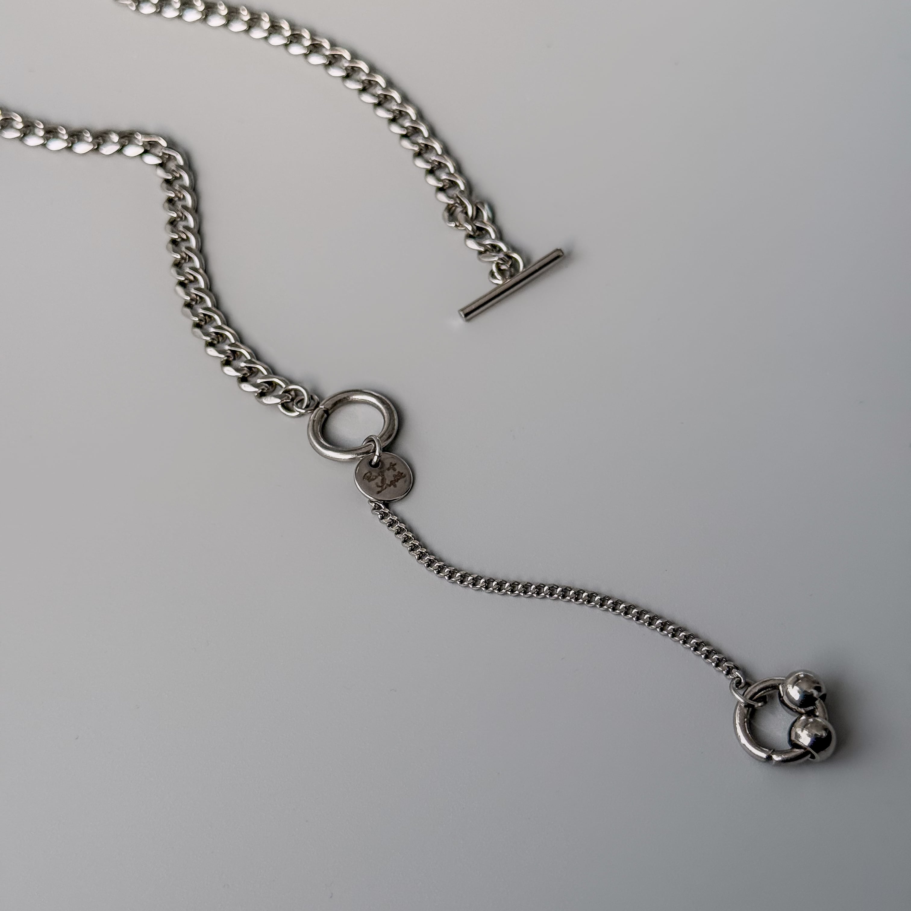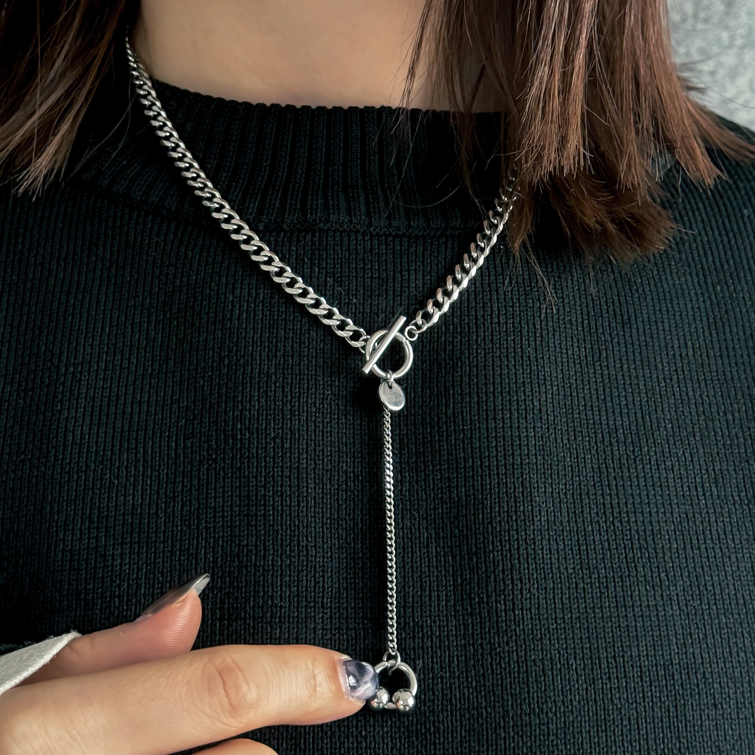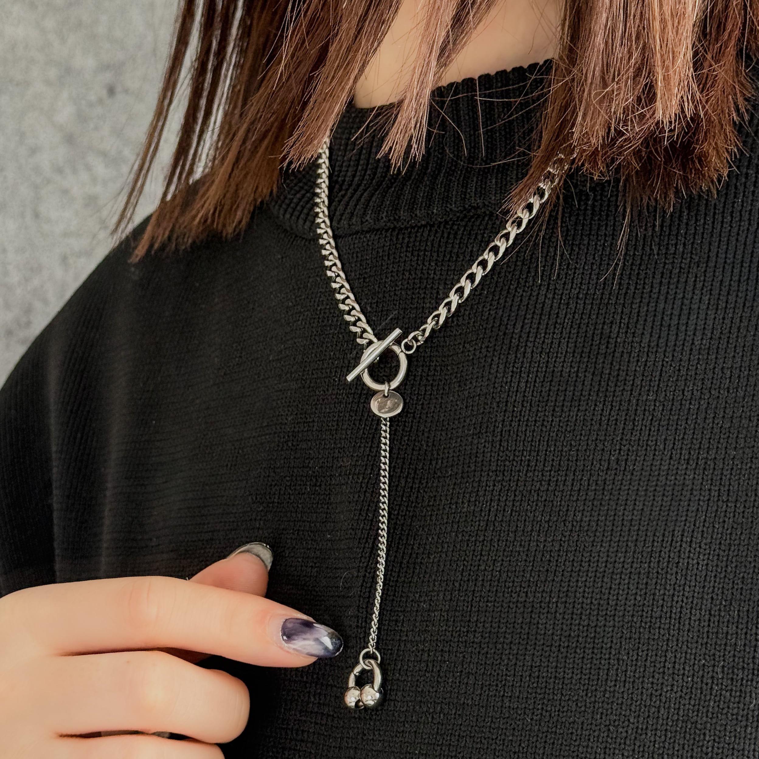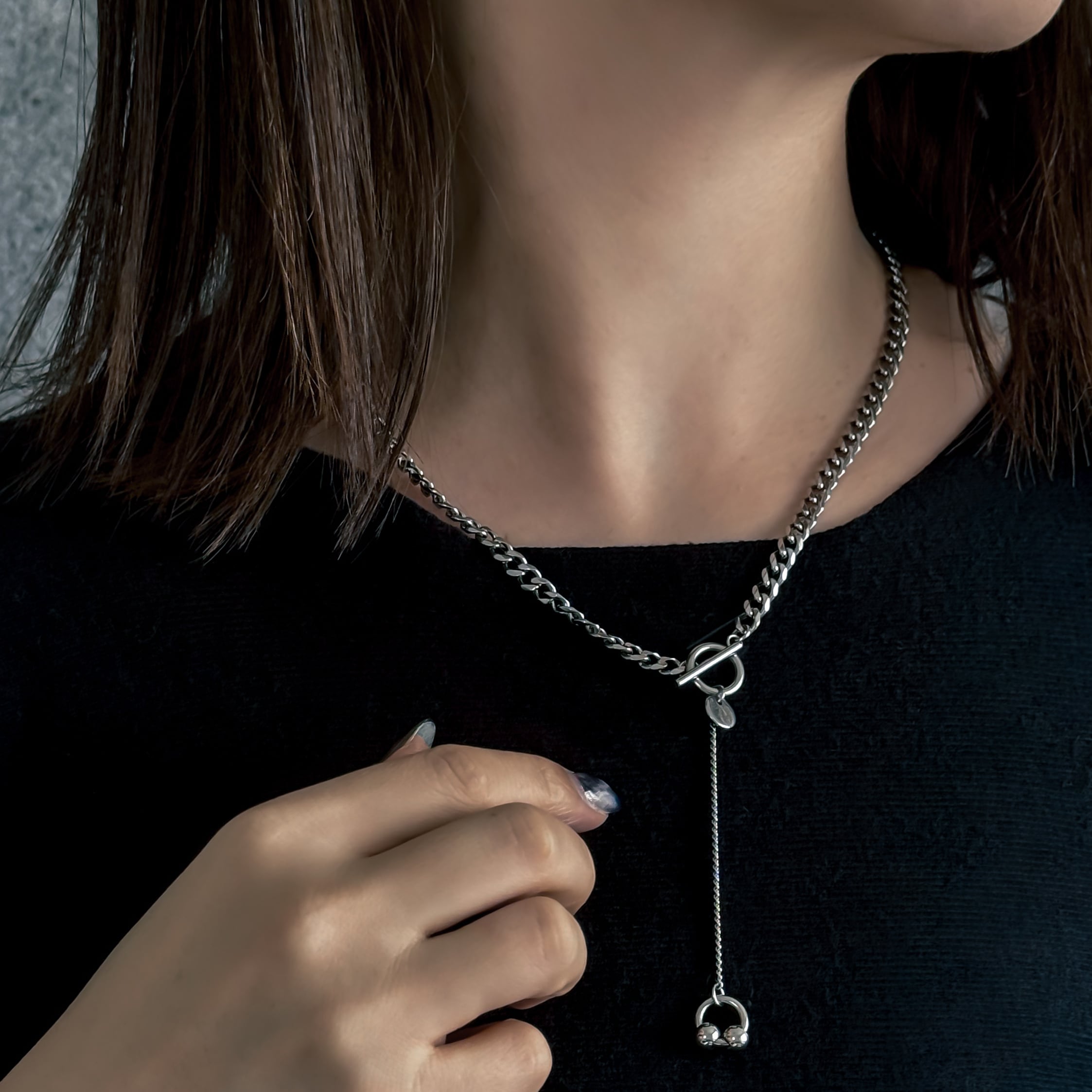 縦に落ちる細いチェーンが、歩いたときやふと視線を落とした瞬間に、静かに揺れて表情を添えます。