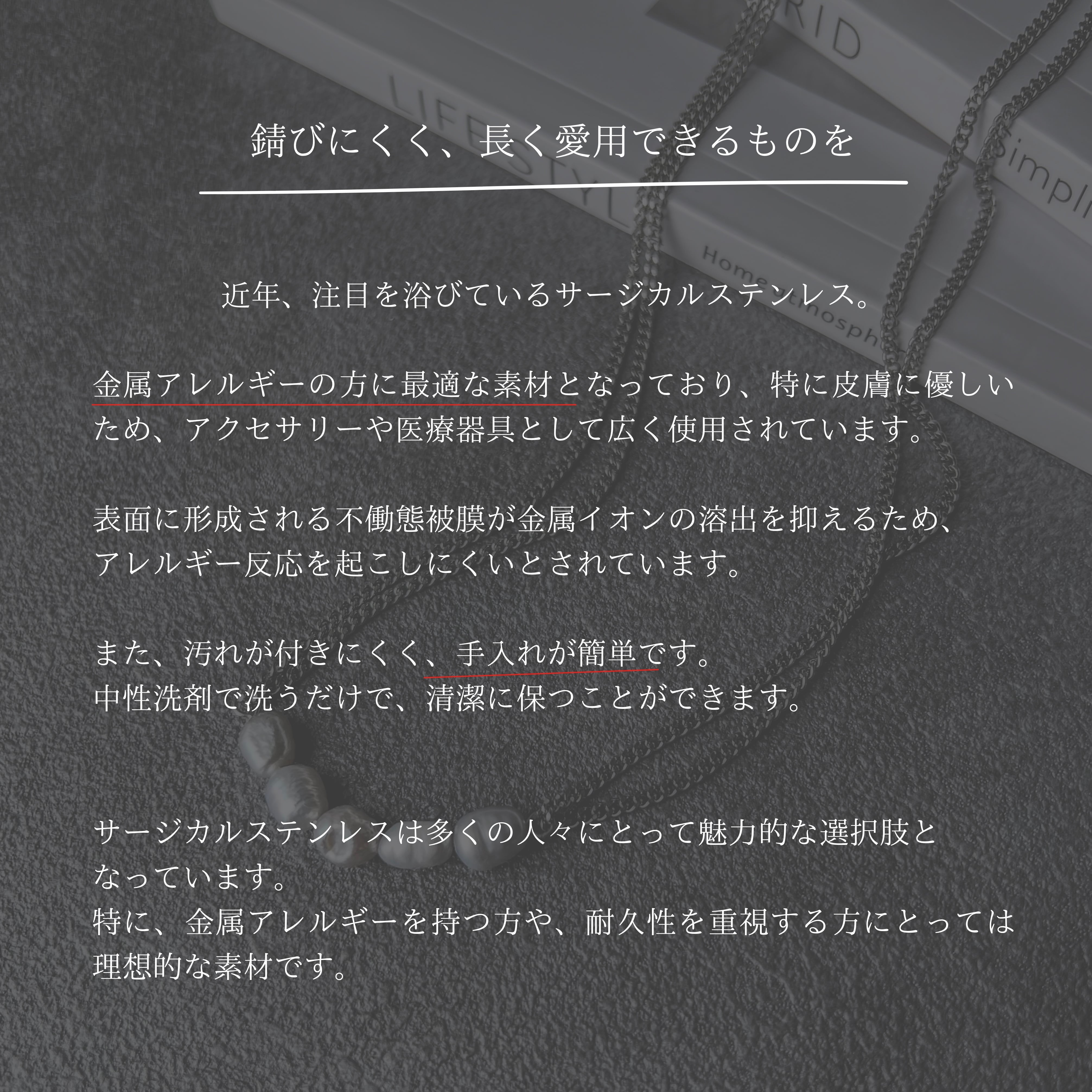 ステンレスは変色・サビに強く、日常使いしやすい素材です。