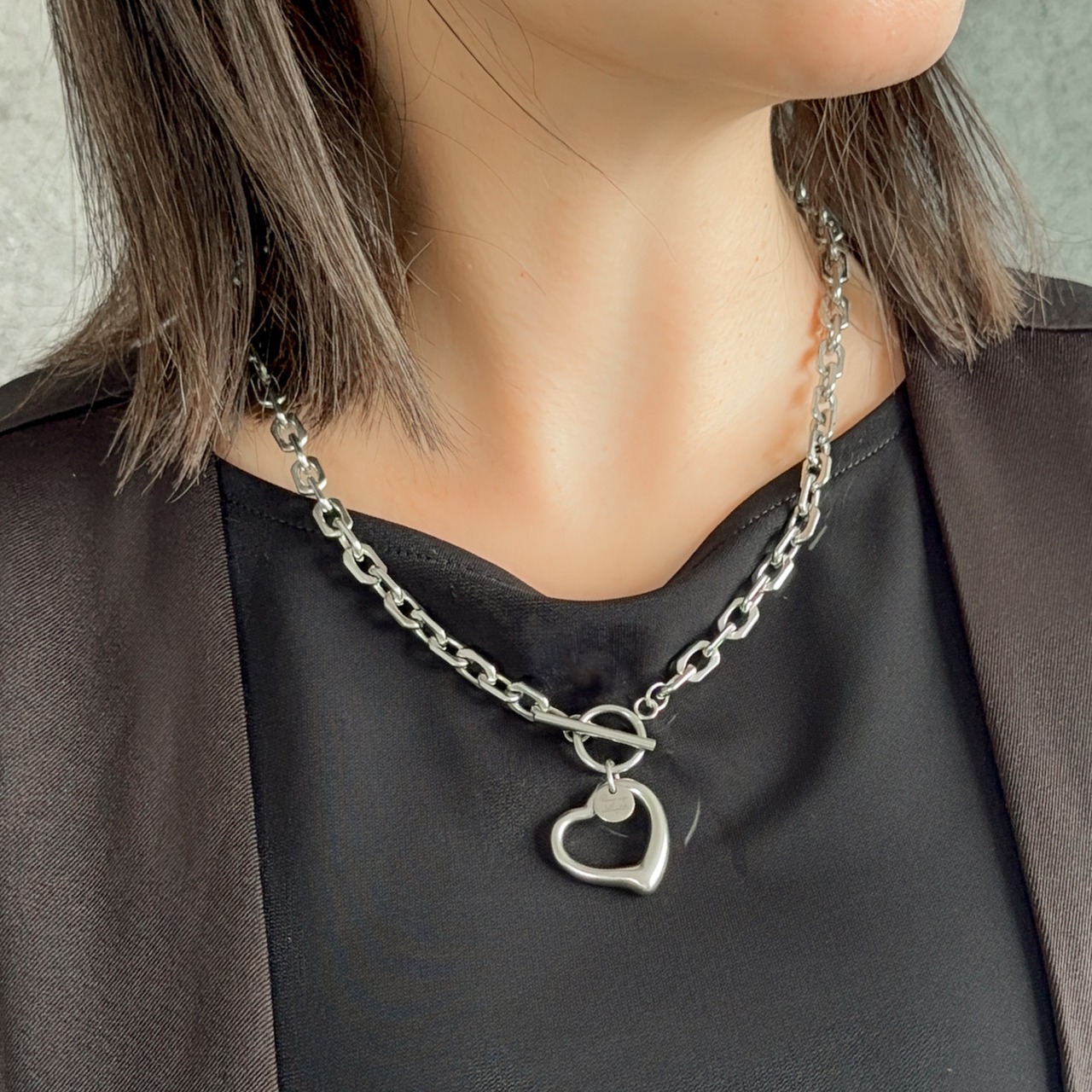 ハートは可愛らしくなりがちですが、モノトーンコーデに合わせやすいスタイリッシュなハートのネックレスに仕上げました。